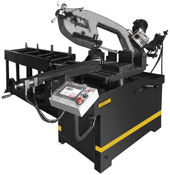 Станок оснащен гидравлическими тисками. На основной панели расположены: цветной сенсорный дисплей, с помощью которого можно задать программу и отслеживать процесс пиления, регулятор скорости опускания пилы и кнопка аварийного останова.