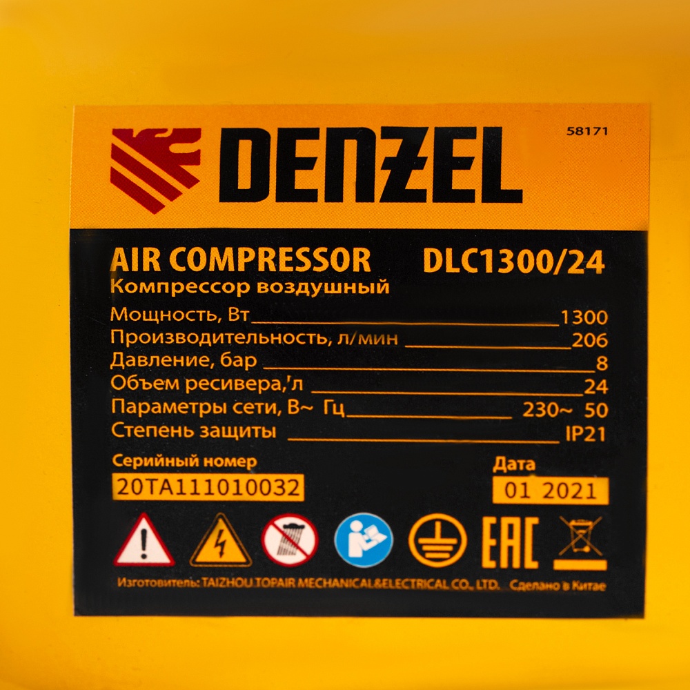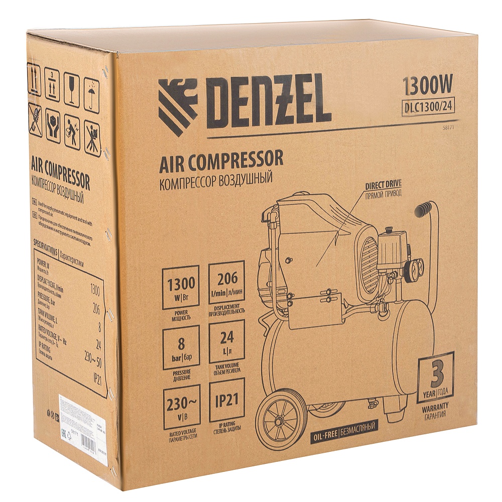 <p>Безмасляный воздушный компрессор Denzel DLC1300/24 58171 мощностью 1,3 кВт, с объемом ресивера 24 л и производительностью на входе 206 л/мин, обеспечивает на выходе чистый сжатый воздух без примесей масла, что позволяет использовать его при окрашивании, креплении паркета и вагонки, продувке электронной техники, накачке шин. Подходит для обеспечения длительной работы пневмоаэрографа, пневмогравера, пневмошуруповерта, пневмодрели и пневмонейлера, а также другого пневмоинструмента. Быстроразъемный коннектор Euro (Rapid) упрощает подключение пневмомагистрали.</p><h2>Преимущества</h2><ul><li>Термозащита — предохранитель останавливает работу двигателя при перегреве, что увеличивает срок службы компрессора.</li><li>Защита по току — в случае перегрузки двигатель отключается для предотвращения поломки.</li><li>Продуманная конструкция — антифрикционное покрытие цилиндра уменьшает трение, а его ребристая поверхность улучшает теплоотвод, что снижает нагрузку на двигатель.</li><li>Стабильная работа без потери производительности — фильтр с бумажным картриджем обладает повышенной пропускной способностью.</li><li>Чистый воздух — уплотнитель на фильтре препятствует попаданию в цилиндр посторонних примесей.</li><li>Безопасность — предохранительный клапан своевременно сбрасывает избыточное давление, предотвращая аварийную ситуацию.</li><li>Быстрый слив конденсата — пробка расположена снизу и имеет специальные упоры для откручивания без инструмента.</li><li>Контроль рабочих параметров — компрессор оснащен двумя манометрами для отслеживания давления в пневмолинии и ресивере.</li><li>Отсутствие масла — компрессор не нуждается в постоянном техническом обслуживании.</li><li>Накладки на ножках — компрессор отличается устойчивостью и не испытывает повышенных вибраций во время работы.</li><li>Мобильность — компрессор, оснащенный ручкой и колесами, весит 22,6 кг, что упрощает его транспортировку.</li><li>Расширенная 3-летняя гарантия — надежность компрессора подтверждена производителем.</li></ul>