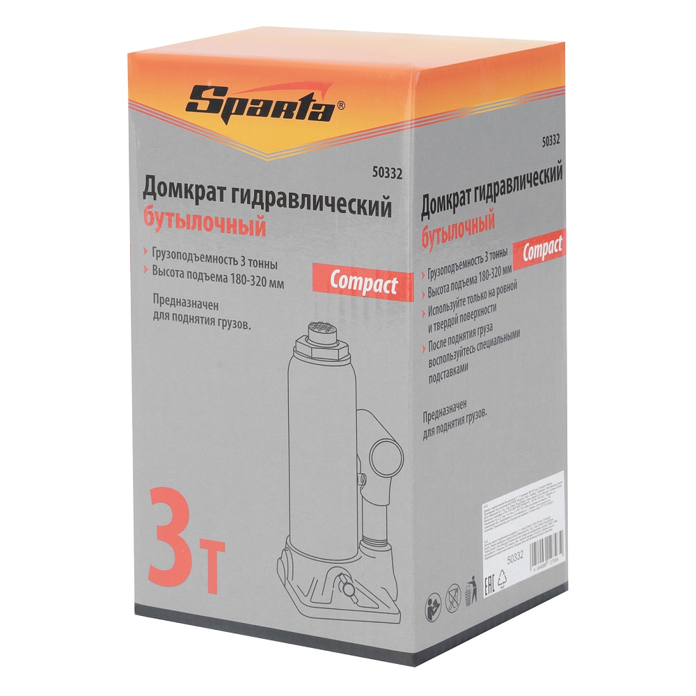 Домкрат гидравлический бутылочный 3т, h подъема 180-320 мм Sparta Compact