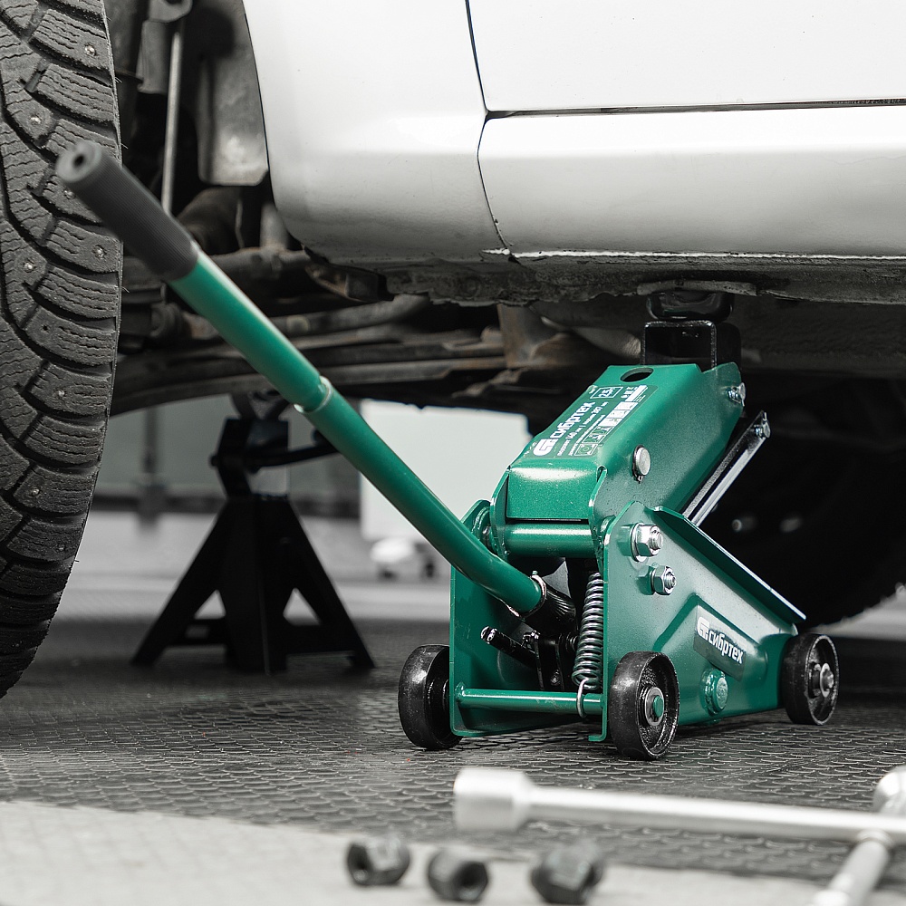- Маневренность — благодаря поворотным колесам домкрат можно быстро подвести под груз.