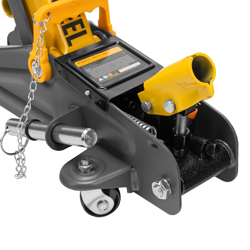 Гидравлический подкатной домкрат с фиксатором Denzel 51154, с высотой подхвата 130 мм, предназначен для плавного подъема грузов массой до 2 т на высоту до 330 мм. Страховочный штифт позволяет фиксировать подъемный рычаг на высоте 260 и 300 мм для безопасной работы. Домкрат пригодится владельцам легковых автомобилей со стандартным клиренсом.