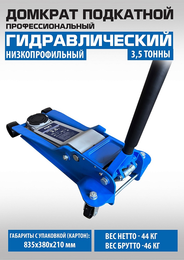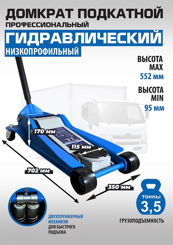 Профессиональный. Подкатной. Низкопрофильный. Двухштоковый механизм. Усиленная конструкция. Быстрый подъем. Имеет повышенную износостойкость. Поворотная ручка, тавотница, лоток для хранения и резиновая накладка на чашку домкрата в комплекте. Грузоподъемность 3,5 тонны с усиленными ребрами жесткости.  Высота подъема мин / макс - 95-552 мм. Вес 46 кг.
