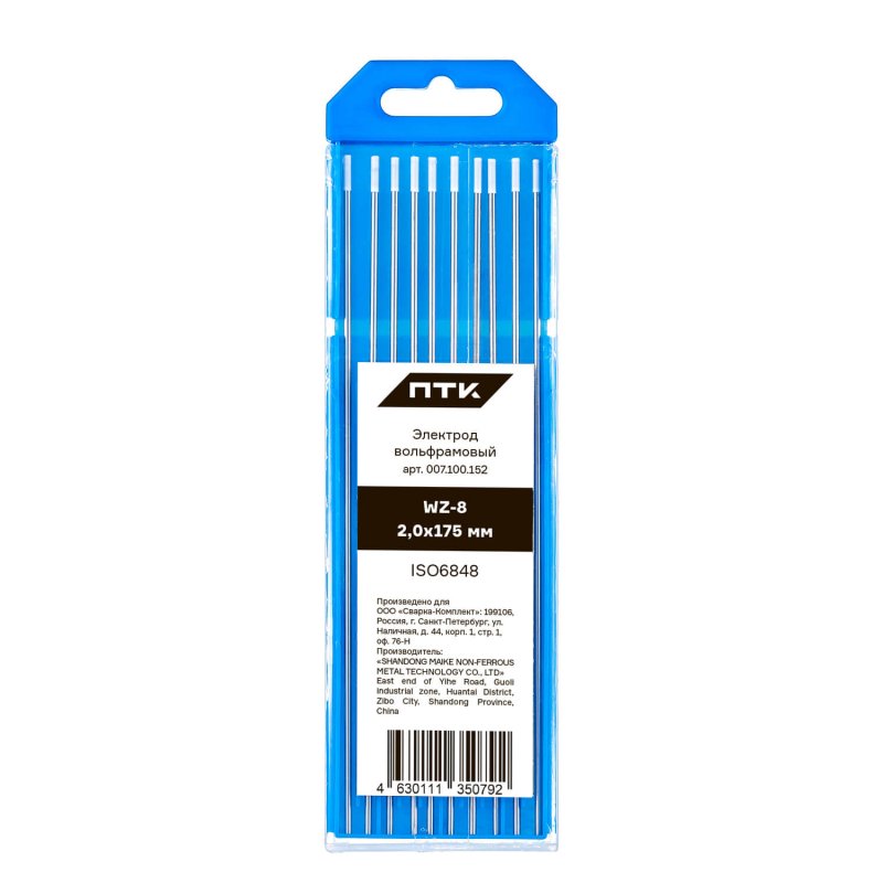 Электрод легирован оксидом циркония (ZrO₂), содержание которого не превышает 0,9%. Диаметр электрода 2,0 мм, длина электрода 175 мм. Вольфрам имеет белый цветовой код. Поставляется в пластиковом пенале по 10 штук. В карточке с товаром указана цена за 1 вольфрамовый электрод.