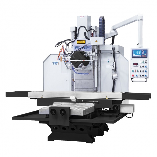 Бесконсольные универсальные фрезерные станки типа BFM2100 Servo используют для обработки крупногабаритных деталей торцовыми, а также цилиндрическими, концевыми, дисковыми и фасонными фрезами. Обработку деталей можно производить при движущемся столе и неподвижной фрезерной головке, при неподвижном столе и подачи головки или при одновременно движущимся столе и фрезерной головки. Фрезерная головка вращается в двух плоскостях не зависимо друг от друга на угол 360 , что позволяет вести фрезерование под углом, как в горизонтальном, так и в вертикальном положении фрезерной головы. Бесступенчатая продольная и поперечная подачи. Станина выполнена из серого чугуна по технологии цельного литья. Возможность ручного зажима осей, не участвующих в перемещении позволяет повысить жесткость и снизить вибрации от режущего инструмента. Сервомотор осуществляет подачу осей с возможностью плавного изменения скорости подачи. Специальное приспособление для поддержания режущего инструмента при работе с горизонтальным шпинделем устанавливается на неподвижном основании станины и придает дополнительную жесткость.
