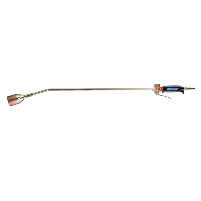Горелка ручная газовоздушная пропановая с одним соплом диаметром 50 мм для нагрева изделий и заготовок из черных и цветных металлов. Горелка с рычагом подачи горючего газа. Длина горелки 900 мм.