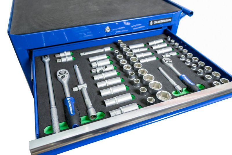 Три ящика тележки снабжены профессиональным инструментом в количестве 232 предмета. Данный комплект можно назвать как стартовый так как включает в себя ручной инструмент с посадочным квадратом 1/4, 3/8 и 1/2 дюйма, большое количество и разновидности бит, отвертки, губцевый инструмент и съемники стопорных колец, что вполне достаточно для выполнения довольно широкого спектра проводимых работ.