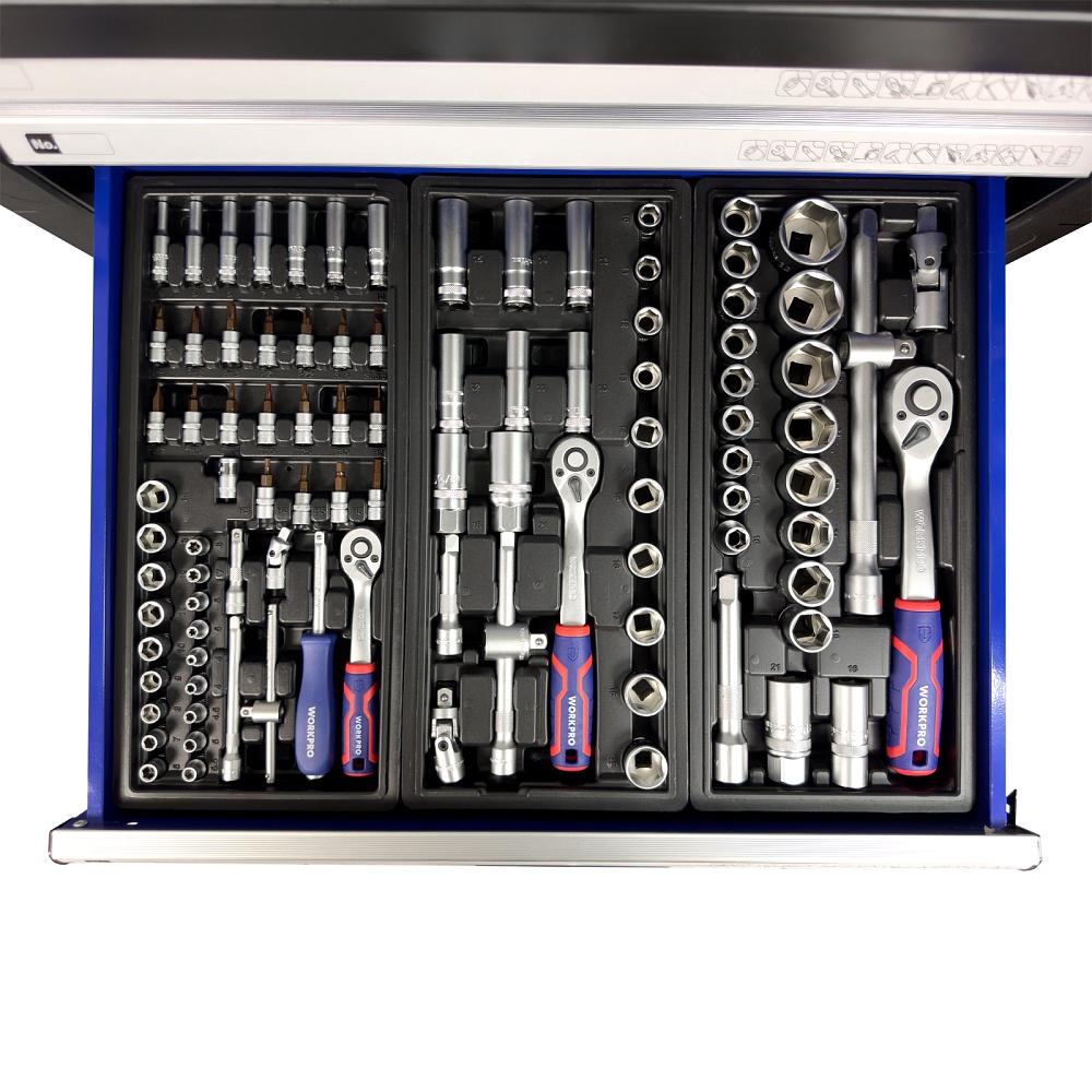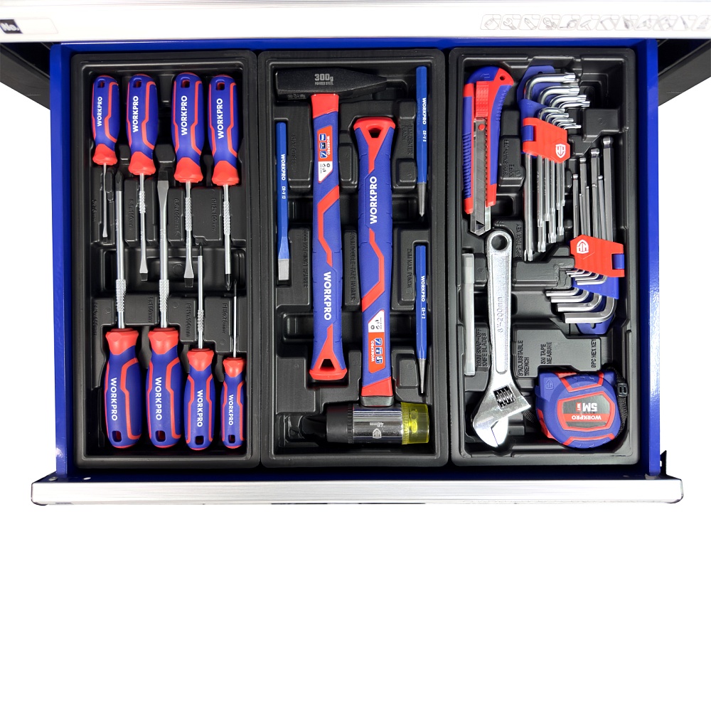 Тележка WORKPRO — это 7 выдвижных ящиков на подшипниках различного объема, где Вы можете разместить свой инструмент для работы, которым часто пользуетесь. Каждый ящик оборудован системой блокировки. Долговечные стальные направляющие прочно удерживают полку в выдвинутом положении.