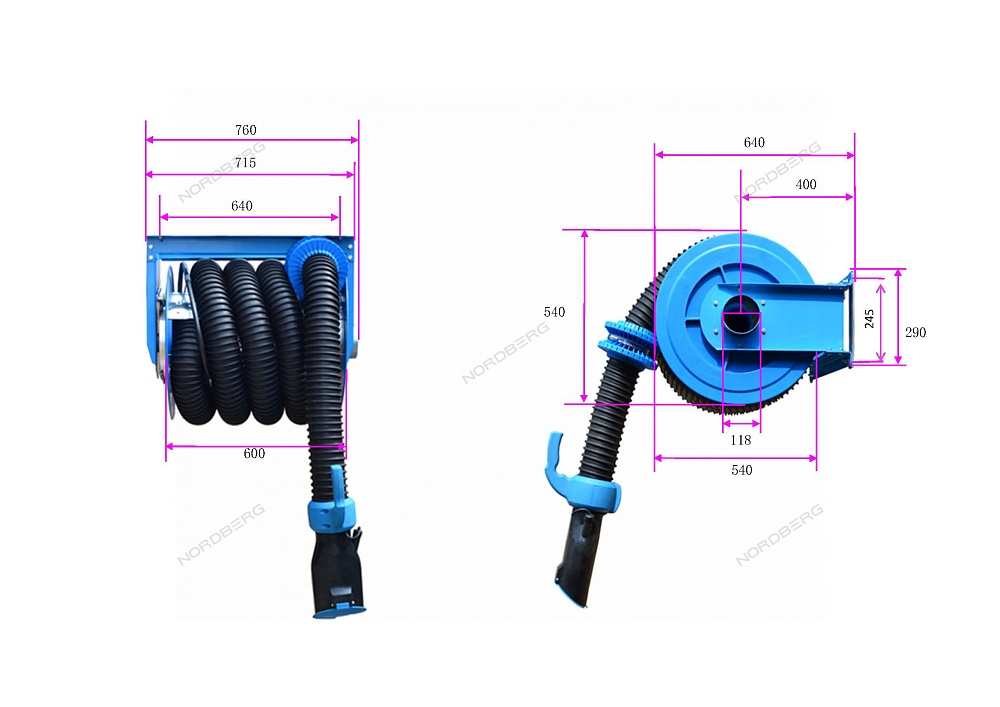 Катушка для сбора выхлопных газов под шланг D=100 мм NORDBERG H8100125 монтируется к потолку или стене. Это позволяет легко расположить изделие максимально удобным образом.