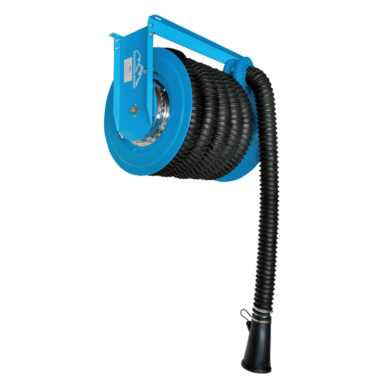 Катушка со шлангом для удаления выхлопных газов (шланг 8,0м. х Ø102 мм)   Механическая пружина возврата шланга. Комплект поставки: шланг из термостойкого армированного эластомера (TPE)., резиновое газоприемное сопло с рукояткой, стопор, салазки для крепления.