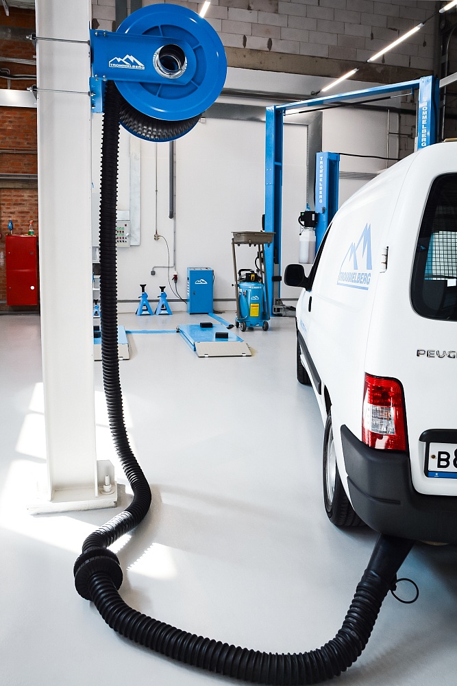 Катушки металлопластиковой конструкции со шлангом и насадкой для удаления выхлопных газов любых легковых автомобилей. Для удаления выхлопных газов катушки напрямую соединяются с вытяжным центробежным электровентилятором.