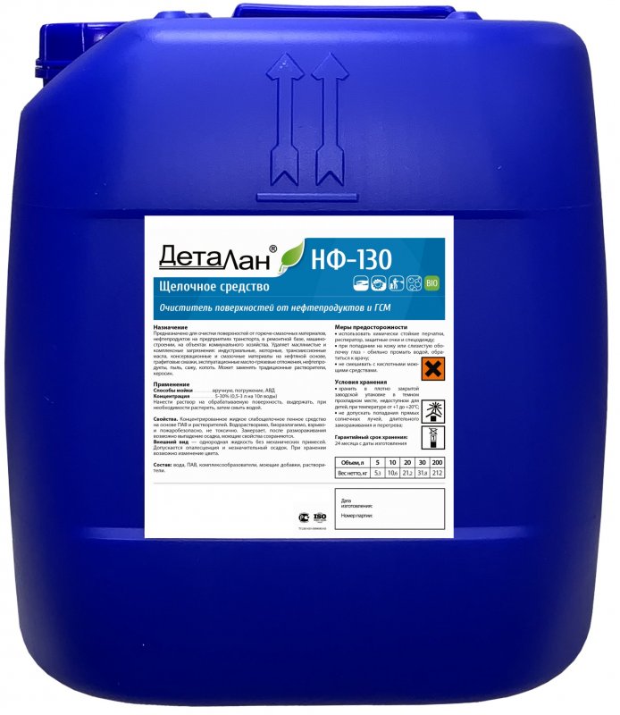 Деталан НФ-130 Очиститель поверхностей от нефтепродуктов и ГСМ (щелочное средство). Цена указана за 10 литров. Поставляется в канистрах — 10, 20, 30 л. Бочки — 200 л.