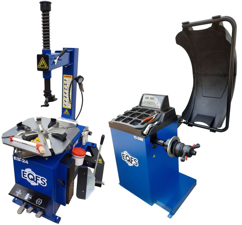 Комплект ES-24 Станок шиномонтажный 11-24"дюйма. Усилие отрыва покрышки 2700 кг. В комплекте: пистолет для подкачки шин + монтажка + пластиковые накладки на зажимные кулачки + регулятор давления с влагоотделителем и манометром. Электропитание на 220В или 380В. +  ES-550 Балансировочный станок. Удобный и понятный интерфейс. Автозапуск опусканием кожуха. Автоматический ввод дистанции и диаметра диска. Лазерная навигация. Автокалибровка. Размеры диска: ширина 3–9” (76-228 мм) , диаметр диска 10–24” (256÷610 мм). Ø покрышки ≤ 760 мм, вес ≤ 65 кг. Вал- 36 мм. Точность ±1гр. 220 В. Режимы работы DINAMIC, STATIC, ALU1, ALU2, ALU3, ALUS, ST.