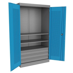Шкаф инструментальный серии «PRF» предназначен для хранения оснастки, приспособлений и инструмента на рабочих местах в мастерских, цехах и других производственных зонах. Шкаф изготовлен из листовой стали и обеспечивает надежное запирание дверей ригельной системой. Шкаф данной модели может комплектоваться либо полками PRF(1) и ящиками PRF(1) – по всей ширине шкафа, при этом максимальное количество полок и ящиков по высоте - 13 штук. При установке перегородки, шкаф делится на две части и может комплектоваться полками PRF(2) и ящиками PRF(2), при этом максимальное количество полок и ящиков по высоте - 13 штук в два ряда. Нагрузка на ящики и планшеты PRF составляет не более 20 кг. Нагрузка на полку – не более 100 кг. Суммарная нагрузка на шкаф не более 400 кг. Шкаф оснащен замком «Евролок». Окраска элементов корпуса осуществляется порошковой полимерной краской: RAL 7037 (пыльно-серый), а дверцы RAL 5015 (небесно-синий) – складская программа, RAL 3003 (красный) – под заказ. Все шкафы отгружаются со склада в разобранном виде. Инструкцию по сборке вы можете скачать с нашего сайта.