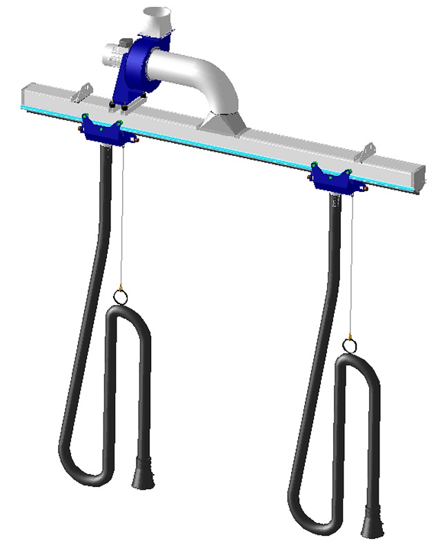 В комплектацию системы входит: профильный алюминиевый рельс, скользящие каретки, термостойкий шланг, подвес для шланга, вытяжные насадки, вытяжной вентилятор, кронштейны для крепления рельса, аксессуары для крепления и подключения вентилятора.