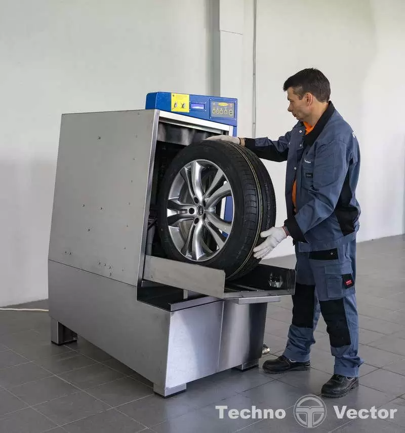 Процесс мойки колес происходит по замкнутому циклу водой с пластиковыми гранулами, при этом грязь осаждается на дно ванны.