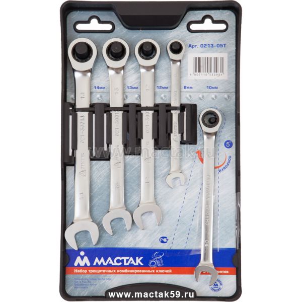 Набор комбинированных ключей с трещоткой МАСТАК 0213-05T содержит 5 предметов. Предназначены для выполнения любых видов работ с крепежом - как дома, так и в авто-слесарных мастерских, станциях технического обслуживания, на производстве.