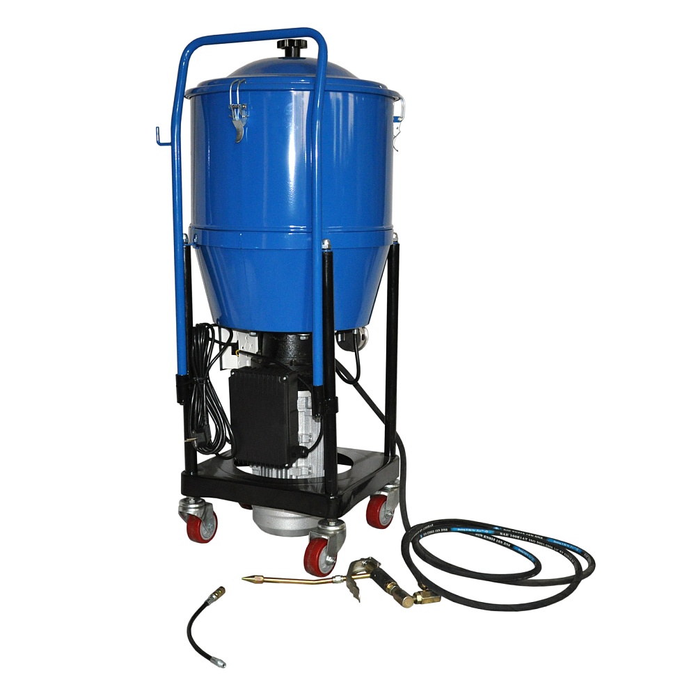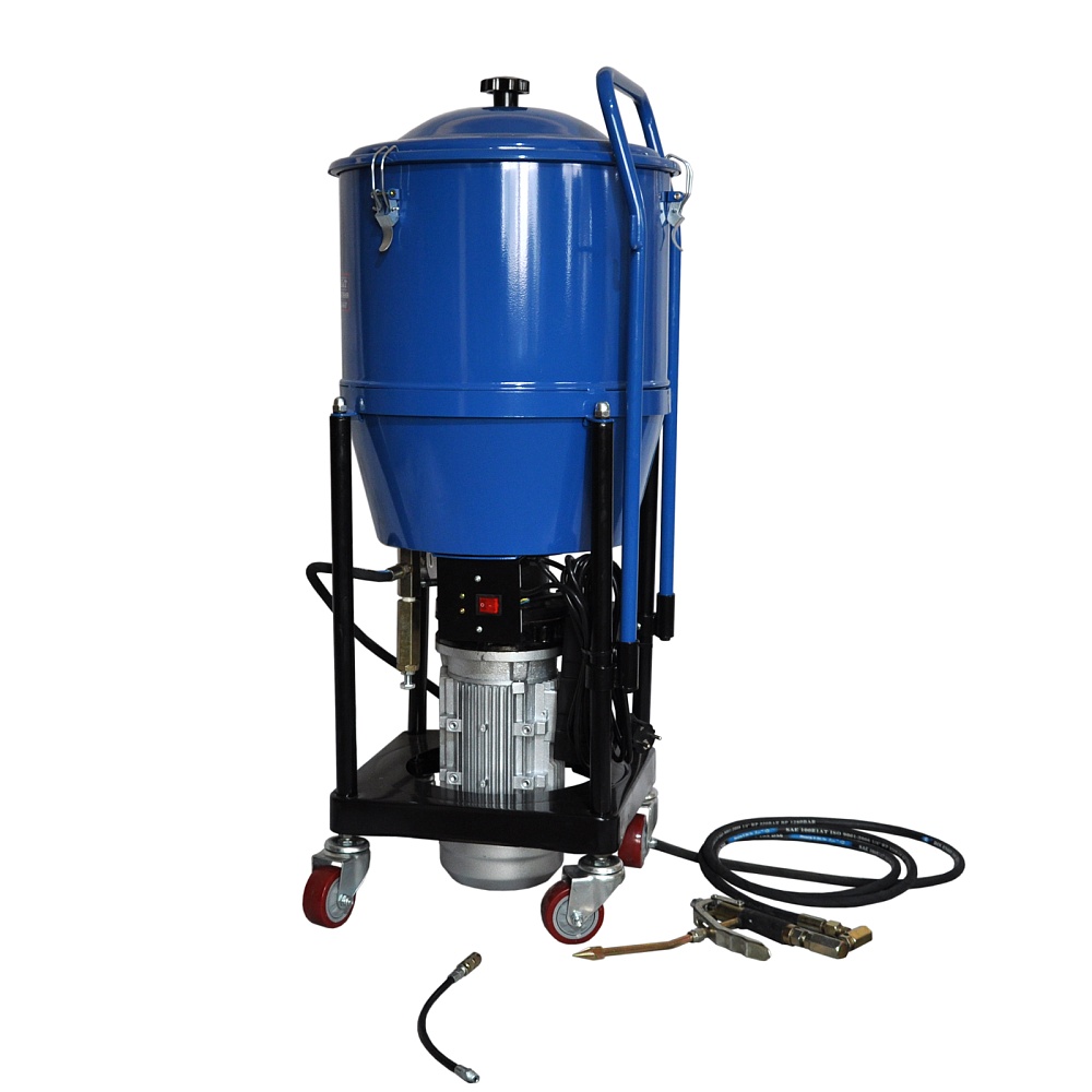 Солидолонагнетатель с электроприводом оснащен вместительным баком объемом 50 литров и мощным двигателем, который автоматически отключается при понижении давления. Устойчивая колесная база с двумя маневренными колесами позволяет без труда перемещать установку по рабочему пространству.