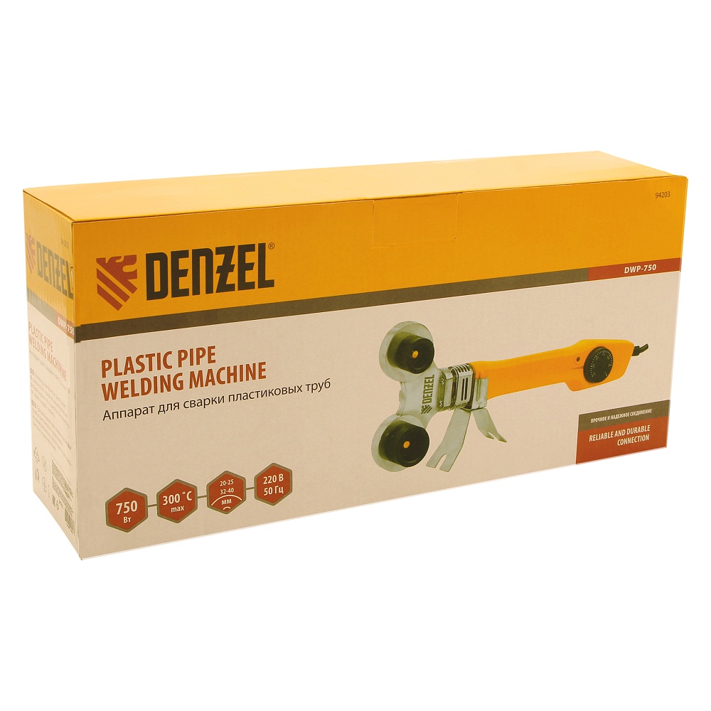 <p>Аппарат для сварки пластиковых труб Denzel DWP-750 94203 мощностью 750 Вт, с рабочей температурой 0-300 ℃, с комплектом насадок диаметром 20-40 мм, применяется при монтаже и разводке систем холодного, горячего водоснабжения, отопления и канализации. Используется для труб из полипропилена и полиэтилена. В основе его функционирования лежит воздействие высокой температурой, которая обеспечивается благодаря мощности 750 Вт. Аппарат работает от бытовой сети, поэтому идеально подходит для применения в домашних условиях.</p><h2>Преимущества</h2><ul><li>Быстрый выход на рабочую температуру — спустя 3-4 минуты аппарат полностью готов к эксплуатации.</li><li>Плавная регулировка температуры 0-300 ℃— пользователь может выбрать, в каком режиме работать, это расширяет спектр задач, с которыми может справиться аппарат.</li><li>Индикация работы — мастер защищен от получения ожогов по неосторожности, т.к. может визуально отследить, что аппарат включен и нагрет.</li><li>Антипригарное покрытие — налипание пластика на насадки исключено, что обеспечивает их долговечность.</li><li>Комфортная работа — эргономичная ручка удобно ложится в руку.</li><li>Компактность — аппаратом удобно работать в местах, где не пройдут более громоздкие модели.</li><li>Широкий комплект поставки — к аппарату прилагаются 4 насадки для соединения труб диаметром 20, 25, 32 и 40 мм, имбусовый ключ и труборез.</li><li>Безопасность — жаропрочная подставка позволяет фиксировать нагретый аппарат в перерывах между сваркой.</li><li>Металлический кейс с ячейками — аппарат со всеми насадками удобно хранить и транспортировать.</li><li>Гарантия 3 года — высокое качество аппарата подтверждено производителем.</li></ul>
