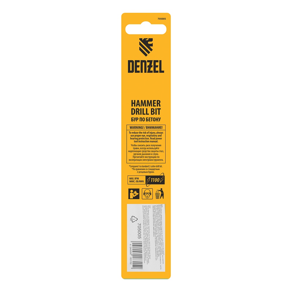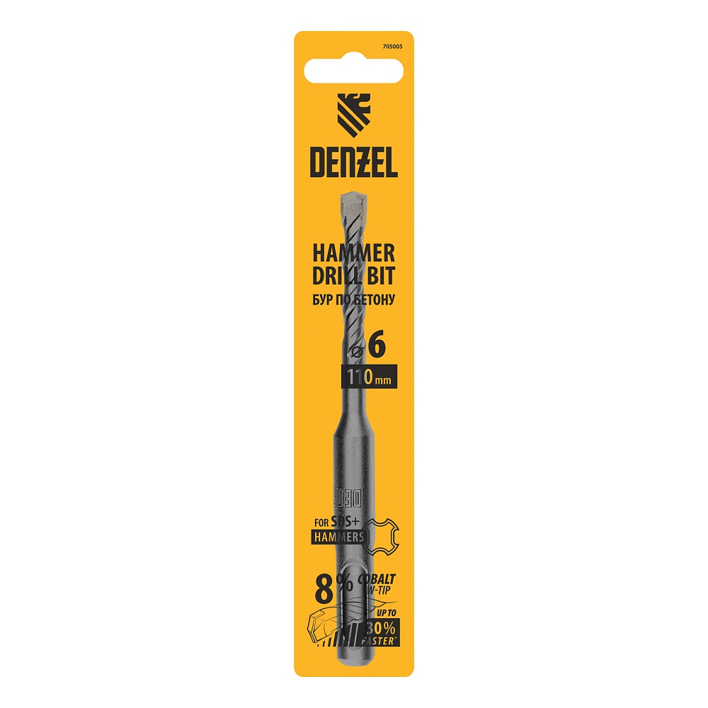 <p>Бур по бетону Denzel Cobalt W-tip 705005 размером 6 х 110 мм, с хвостовиком SDS-plus и двойной спиралью, предназначен для сверления бетона, кирпича и камня. Используется в качестве оснастки для перфораторов с патроном SDS-plus. Бур оптимален для проведения строительных, ремонтных, монтажных работ.</p><h2>Преимущества</h2><ul><li>Высокий ресурс — режущая твердосплавная пластина из сплава ВК8 твердостью 80-90 HRC с W-образной заточкой позволяет увеличить скорость работы на 30%, в том числе при сверлении камня.</li><li>Прочность и износостойкость — рабочая часть из легированной стали 40Х выдерживает интенсивные и длительные ударные нагрузки, что делает бур самым высокопроизводительным среди аналогов средней цены.</li><li>Эффективный отвод шлама — двойная спираль и канавка с дополнительным желобом обеспечивают быстрое удаление пыли, что предотвращает перегрев рабочей части и продлевает срок службы бура.</li><li>Высокая технологичность — бур изготовлен в соответствии с Европейским стандартом, что гарантирует его качество и эффективность сверления.</li><li>Удобное хранение — оснастка поставляется в упаковке с европодвесом.</li></ul>