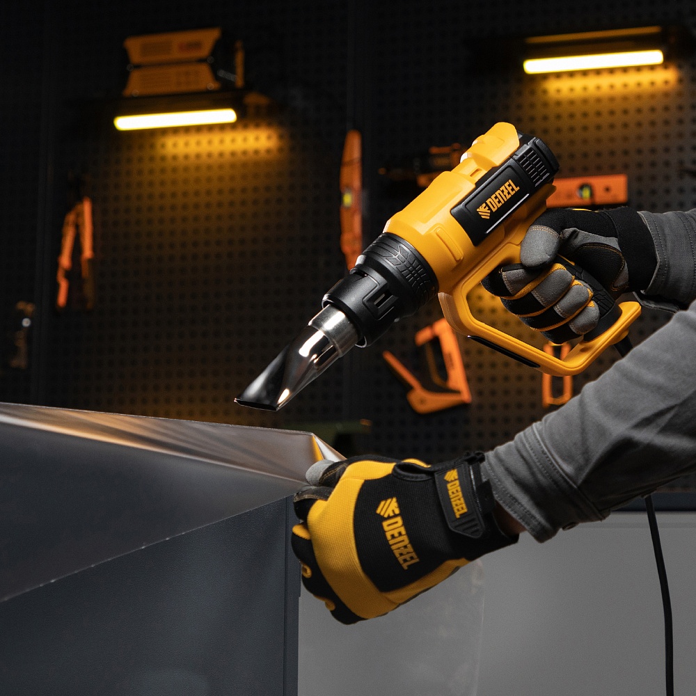 <p>Профессиональный технический фен Denzel HG-2000E 28007 мощностью 2000 Вт, с 2 режимами и LCD дисплеем, предназначен для нагрева и сушки различных соединений и поверхностей. Применяется при снятии лакокрасочных покрытий, удалении старого линолеума и плитки, пайке металла и сварке пластика, разморозке труб, а также в процессе других задач в быту и на строительных объектах.,Высокая мощность двигателя 2 кВт обеспечивает производительность 250-500 л/мин. Максимальная рабочая температура составляет 650 ℃. Надежный и долговечный нагревательный элемент с керамическим каркасом устойчив к продолжительной эксплуатации.</p><h2>Преимущества</h2><ul><li>Два режима работы — нагрев и продувка с температурой 50-650 и 50 ℃ соответственно (продувка снижает риск перегрева и теплового удара после отключения питания).</li><li>Легкий контроль рабочих параметров — фен оснащен LCD дисплеем.</li><li>Функция памяти — можно сохранить до 4-х настроек температуры и производительности, чтобы быстро перейти к ранее использованному режиму.</li><li>Поддержание необходимой температуры — фен оснащен датчиком обратной связи между блоком управления и нагревательным элементом.</li><li>Удобная настройка — независимая ступенчатая регулировка температуры и производительности расширяет спектр задач, с которыми может справиться фен.</li><li>Защита от перегрева и перегрузки — фен автоматически отключается при возникновении нештатных ситуаций (замыкании спирали, остановке вентилятора, перекрытии выходного отверстия), что исключает его поломку.</li><li>Полная готовность к работе — к устройству прилагается комплект дополнительных насадок.</li><li>Эргономичная и сбалансированная конструкция — фен можно установить на плоской поверхности соплом вверх, избежав отключения при перерыве в работе.</li><li>Комфорт и безопасность — прорезиненная рукоятка D-образной формы хорошо ложится в руку и исключает случайное соприкосновение с разогретой поверхностью.</li><li>Кабель питания длиной 3 м с резиновой изоляцией — можно расширить рабочую зону без помощи удлинителя, работать при температуре от 0 ℃ и без риска поломки подвергать фен кратковременному воздействию высоких температур.</li><li>Удобное хранение и транспортировка — инструмент поставляется в пластиковом боксе.</li><li>Гарантия 3 года — высокое качество фена подтверждено производителем.</li></ul>