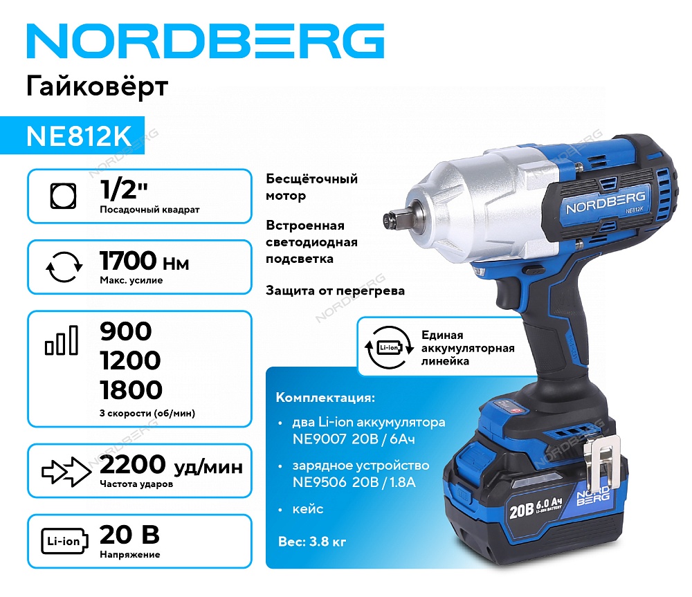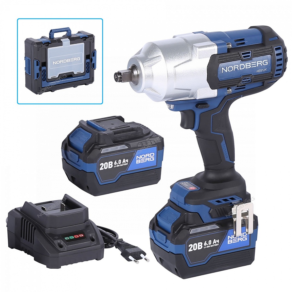 Гайковерт аккумуляторный, 1/2", 21 В, 1700 Нм, 2 аккумулятора 6A и зарядное устройство, в кейсе NORDBERG NE812K купить в Самаре цена ✅ - Все для СТО