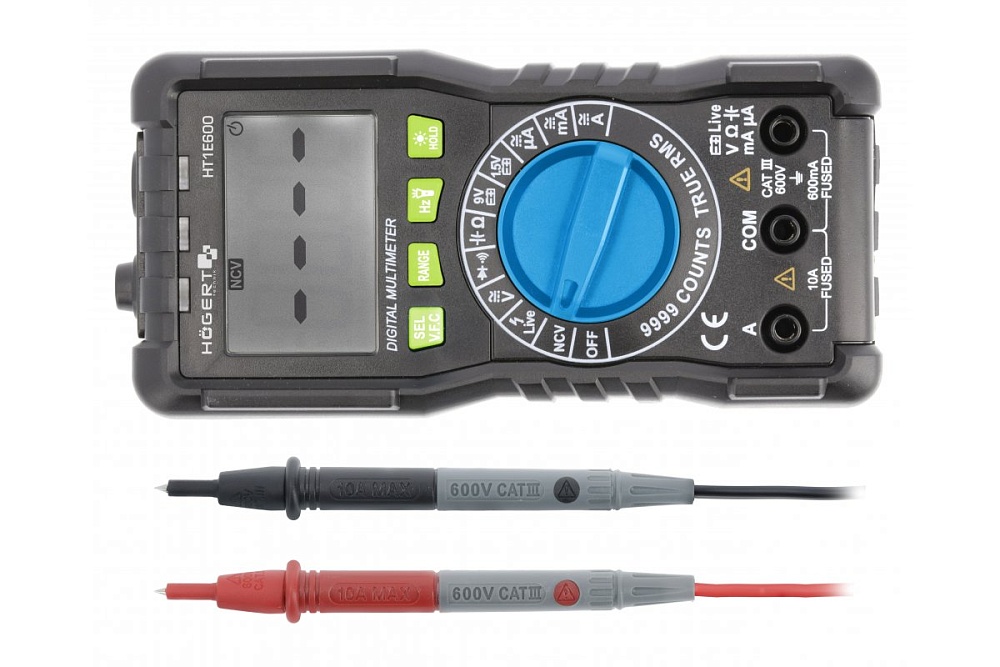возможность измерять напряжение постоянного и переменного тока до 600 В, постоянный и переменный ток до 10 А и сопротивление до 99,99 MΩ, емкость до 99,99 мФ, частоту до 60 кГц, проводить тест диода и аккумулятора 1,5 / 9 В;