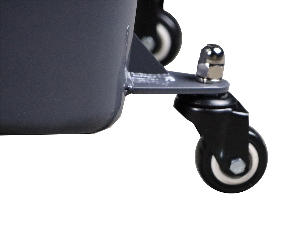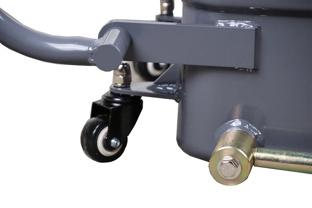 Емкость для сбора отработанного масла и других технических жидкостей KRAFTWELL, модель KRW1851 оснащена четырьмя поворотными колесами для перемещения по ровной горизонтальной поверхности и удобной рукояткой.