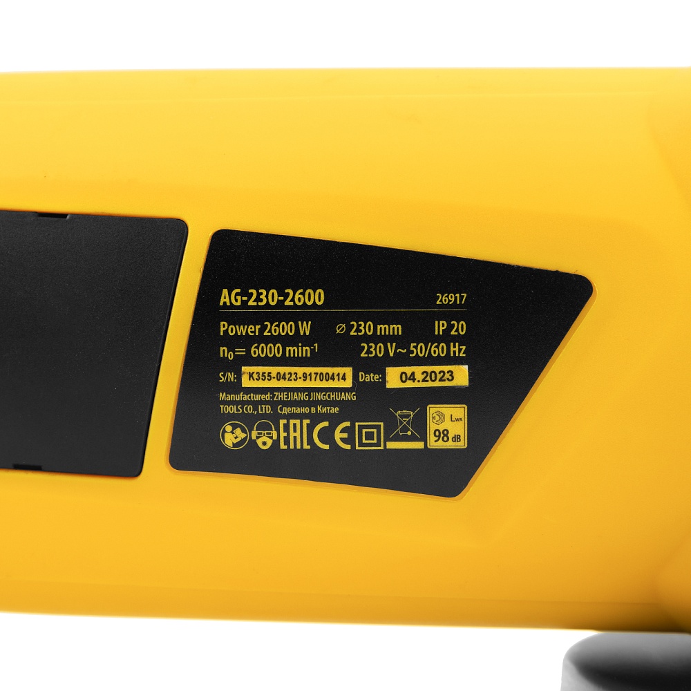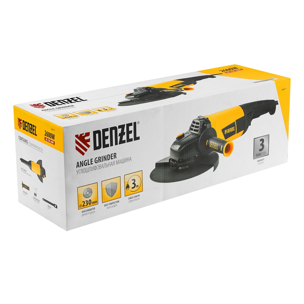 <p>Угловая шлифовальная машина Denzel AG230-2600 26917 мощностью 2600 Вт совместима с насадками максимальным диаметром 230 мм, поддерживает частоту вращения шпинделя 6000 об/мин, благодаря чему эффективно справляется с обработкой и зачисткой поверхностей, а также резкой, шлифовкой металла толщиной до 80 мм и камня. Пригодится дома, в гараже и на даче.</p><h2>Преимущества</h2><ul><li>Высокий ресурс — усиленная пылезащита обеспечивает 450 часов работы даже при резке камня или бетона.</li><li>Безопасность — кнопка блокировки предотвращает случайный запуск УШМ.</li><li>Надежность — усовершенствованная конструкция щеточного узла обеспечивает стабильную работу двигателя.</li><li>Быстрая подготовка к работе — для установки защитного кожуха на УШМ не требуются дополнительные инструменты.</li><li>Удобное обслуживание — в комплект входят специальный ключ и запасные угольные щетки.</li><li>Мобильность — кабель длиной 3 м позволяет увеличить рабочую зону.</li><li>Эргономичность — боковую рукоятку можно установить в 1 из 3 положений: слева, справа или сверху.</li><li>Комфортная работа — прорезиненная рукоятка удобно лежит в руке и не выскальзывает из ладони.</li><li>Гарантия 3 года — качество шлифовальной машинки подтверждено производителем.</li></ul>