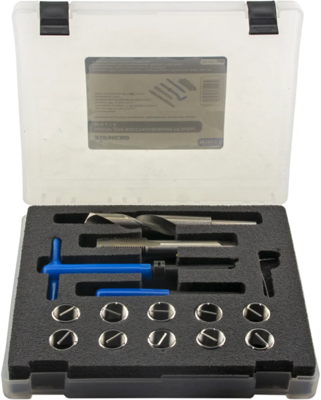 - Применение данного набора обеспечивает быстрое восстановление поврежденной резьбы при помощи специальных приспособлений.