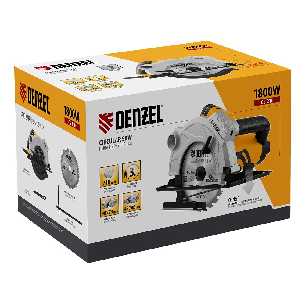 <p>Циркулярная пила Denzel CS-210 27305 — мощная и производительная, имеет максимальную глубину реза в линейке Denzel CS — 73 мм, что обеспечивает эффективную работу с досками, фанерой, ДСП и другими листовыми древесными материалами.,Справляться с поставленными задачами помогают коллекторный двигатель мощностью 1,8 кВт, который обеспечивает частоту вращения 5000 об/мин, и пильный диск 210 х 3 мм. Глубина пропила регулируется до 73 мм, что позволяет работать с материалами разной толщины.</p><h2>Преимущества</h2><ul><li>Широкий спектр работ — при применении специальной оснастки пила может использоваться для реза тонкого мягкого металла, пластика и ламинированных материалов.</li><li>Высокая точность — лазерный указатель, показывающий линию предстоящего среза, и стальная параллельная направляющая помогают осуществлять ровные прямые пропилы без дополнительной разметки.</li><li>Оптимальное положение пильного диска — регулировочный винт позволяет точно настроить угол наклона в диапазоне 0-45 градусов.</li><li>Защита от случайного пуска — блокировка кнопки включения позволяет избежать внезапного запуска пилы, что делает работу с инструментом более безопасной.</li><li>Индикатор подключения к сети — световое обозначение позволяет определить готовность двигателя к запуску.</li><li>Эффективная система удаления опилок — к пиле можно подключить пылесос или пылесборник, чтобы сохранить рабочую площадку в чистоте.</li><li>Безопасность — подвижный защитный кожух закрывает верхнюю часть пильного диска и исключает контакт с лезвием</li><li> после отключения пилы кожух полностью изолирует диск от внешних воздействий.</li><li>Дополнительная рукоятка — инструмент удобно удерживать второй рукой, что минимизирует риск соприкосновения с пильным диском.</li><li>Быстрая смена оснастки — с помощью кнопки блокировки шпинделя и ручки отвода защитного кожуха даже начинающий мастер сможет без труда заменить пильный диск.</li><li>Оптимальная длина сетевого кабеля 3 м — такое решение обеспечивает расширенную рабочую зону. </li><li>Небольшой вес 5,5 кг — мастеру гораздо проще вести инструмент при распиле, он обеспечивает устойчивый и ровный ход.</li><li>Гарантия 3 года — высокое качество пилы Denzel подтверждено производителем.</li></ul>