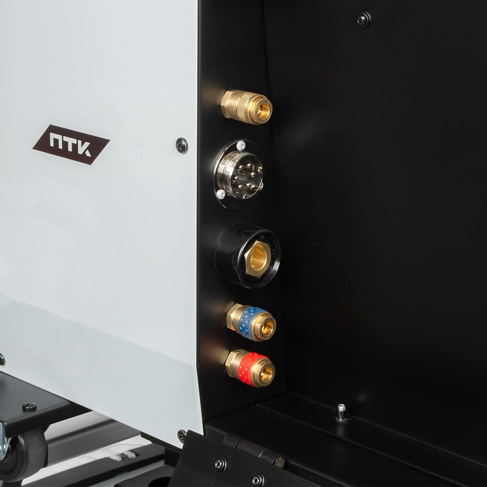 Оборудование поставляется в комплекте с тележкой для перемещения аппарата, подающего механизма, блока жидкостного охлаждения и баллона с защитным газом. Тележка обладает надежной усиленной конструкцией, где толщина металла около 3 мм.