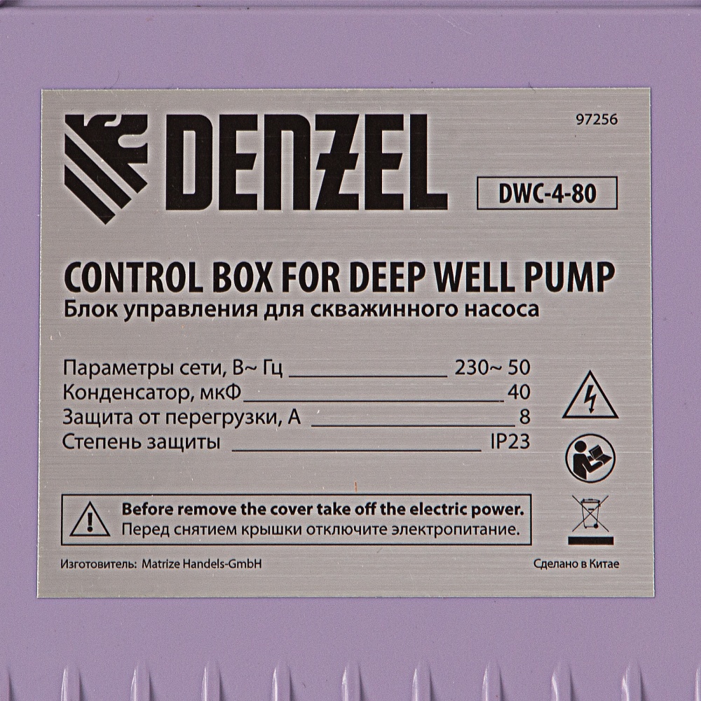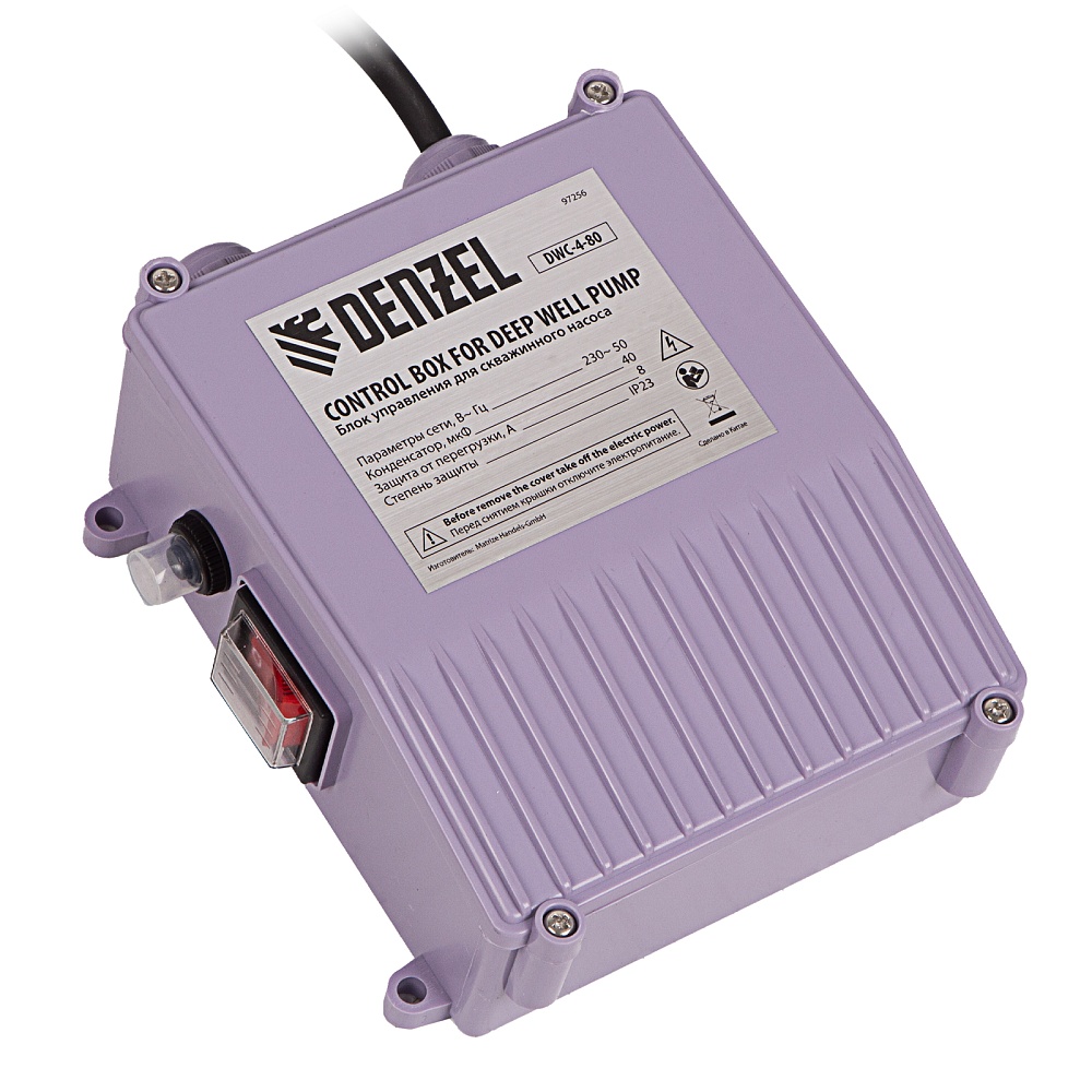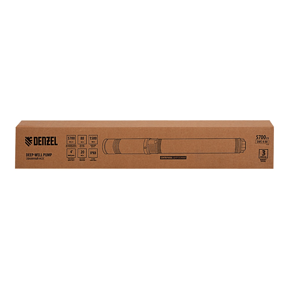 <p>Скважинный насос Denzel DWC-4-80 97256 производительностью 5700 л/ч, диаметром 4″ и мощностью 1500 Вт обеспечивает напор до 80 м. Предназначен для подачи чистой воды из скважин, колодцев, систем водоснабжения, различных накопителей и пресных водоемов с глубины до 17 м (с наращиванием кабеля — до 80 м). Насосная часть из 11 центробежных импеллеров обеспечивает повышенную производительность, что позволяет организовать не только полив приусадебных участков, но и бытовое водоснабжение. </p><h2>Преимущества</h2><ul><li>Надежность — маслонаполненный двигатель с мембраной компенсации теплового расширения обеспечивает стабильную работу даже при интенсивных нагрузках.</li><li>Коррозионная стойкость — корпус и винты выполнены из нержавеющей стали, крышки корпуса — из латуни.</li><li>Удобное управление — насос подключается к выносному блоку с реле защиты от перегрузки и выключателем питания.</li><li>Электробезопасность — длина съемного сетевого кабеля составляет 20 м (возможно его наращивание), штепсельная вилка оснащена заземляющим контактом.</li><li>Водонепроницаемость — рабочий узел защищен от попадания воды по стандарту IPX8. </li><li>Система защиты от перегрева — при превышении допустимой температуры двигатель отключается для предотвращения поломки.</li><li>Быстрое начало работы — напорная магистраль легко подключается к выходному отверстию, образуя герметичное соединение, насос не нужно заполнять водой, достаточно погрузить его в скважину и включить.</li><li>Несложная установка — в верхней части корпуса имеются проушины для закрепления троса, при помощи которого насос погружается в воду.</li><li>Работа без остановок — насос не останавливается при попадании песка и других частиц размером до 0,5 мм, заборная часть легко очищается при необходимости.</li><li>Простая подготовка к хранению — достаточно промыть насос, слить из него воду и протереть чистой тряпкой.</li><li>Гарантия 3 года — надежность насоса подтверждена производителем.</li></ul>