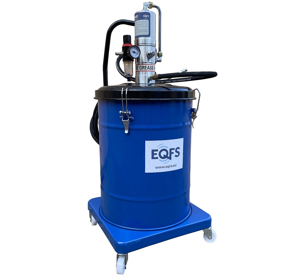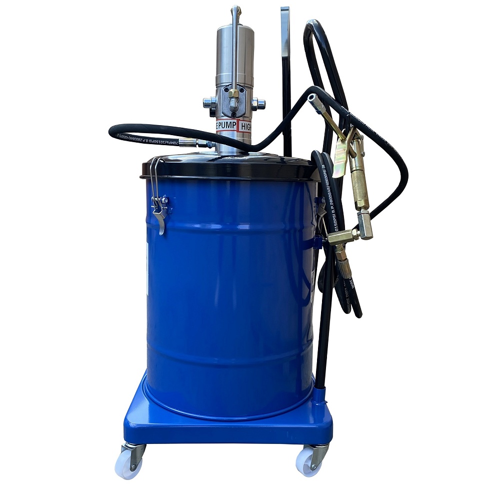 Корпус нагнетателя смазки – стальной, насос изготовлен из анодированной стали. Фиксация насоса с крышкой к баку для смазки производится с помощью металлических защелок с резьбой. Для удобства транспортировки нагнетатель оборудован металлической ручкой в верхней части корпуса. Нагнетатель оборудован маслобензостойким армированным шлангом длиной 4 м. Солидолонагнетатель для консистентной смазки, установленный на колесах, имеет легкий вес и экономичную конструкцию для удобства перемещения и эксплуатации.