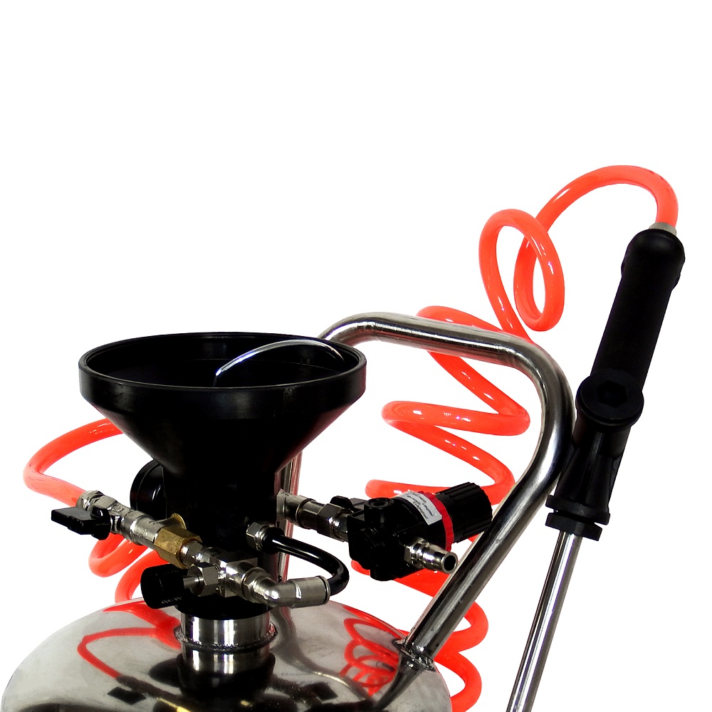 Эту модель успешно применяет множество сервисов и СТО разного уровня. Ее можно назвать одной из самых продвинутых и современных. Витой шланг повышенной прочности с длинным пистолетом позволяет точно и быстро наносить пену. Раструб для залива жидкости оснащен пробкой и манометром. На боку корпуса размещен индикатор заполненности резервуара. Изделие выполнено из нержавеющей стали высокой прочности толщиной 1.5 мм, что обеспечивает долгую службу без коррозии как снаружи, так и внутри.