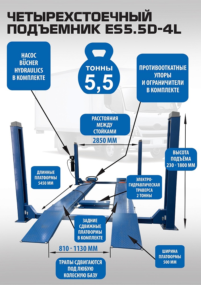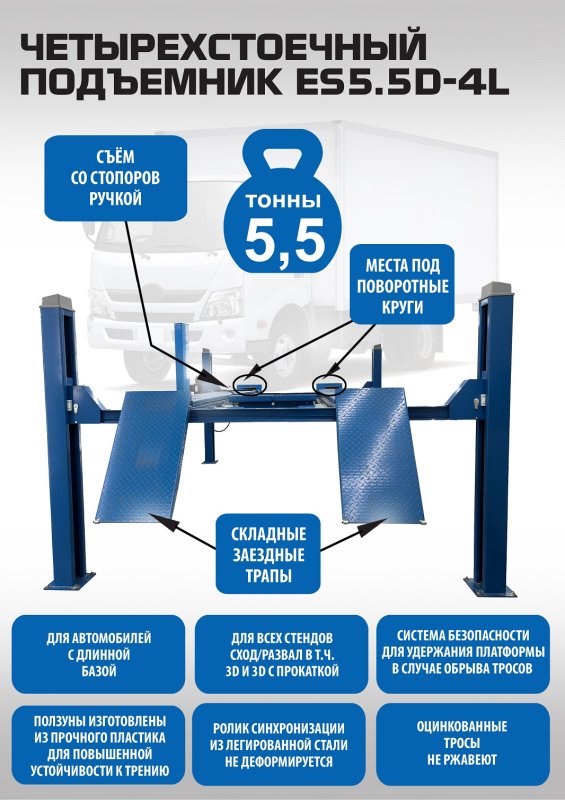 Расстояние между платформами регулируемое – 860-1200мм, что позволит обслуживать практически все автомобили независимо от ширины колесной базы. Подъемник 4х стоечный оборудован независимой гидравлической двухточечной траверсой г/п 2,0т. Также оборудован задними подвижными платформами и местами для установки передних поворотных кругов. Передние поворотные круги в комплект поставки подъёмника не входят (опция). Круги всегда входят в комплект поставки стенда сход-развал. Автомобильный электрогидравлический четырехстоечный подъемник грузоподъемность 5.5т. Предназначен для слесарных, сход-развальных работ в том числе с применением технологии 3D.