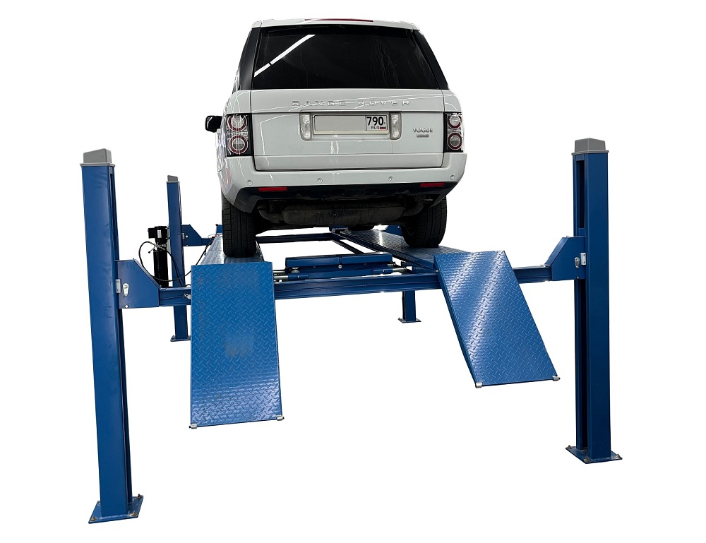 Электрогидравлический четырехстоечный подъёмник грузоподъемностью 5 т для обслуживания легкового транспорта Оснащение подъемника дает возможность производить регулировку развал/схождения, ремонт тормозной и рулевой систем, и другие работы