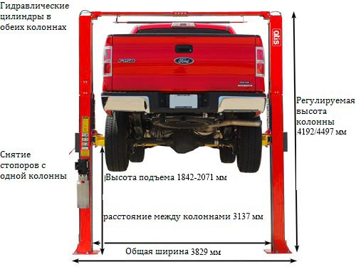 Двухстоечный электрогидравлический подъемник с верхней синхронизацией, грузоподъемность 5.5 т, высота колонны 4192/4497мм, механическое управление стопорами на одной колонне.