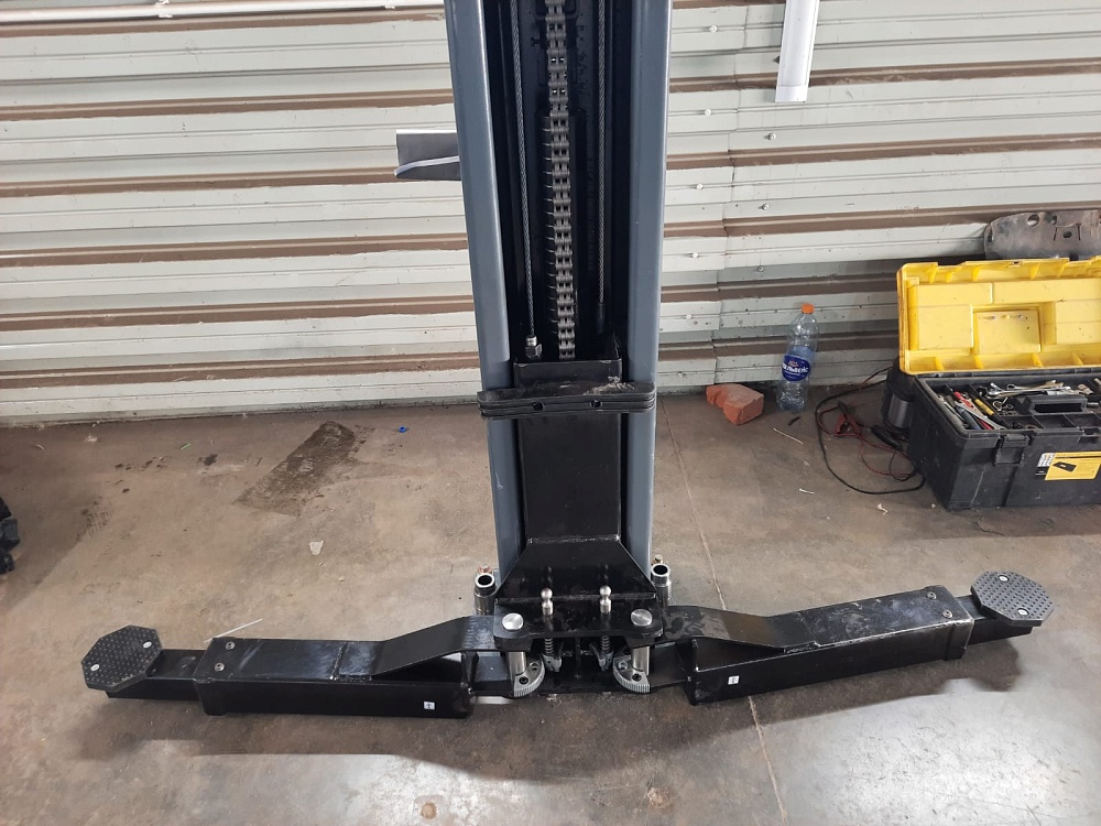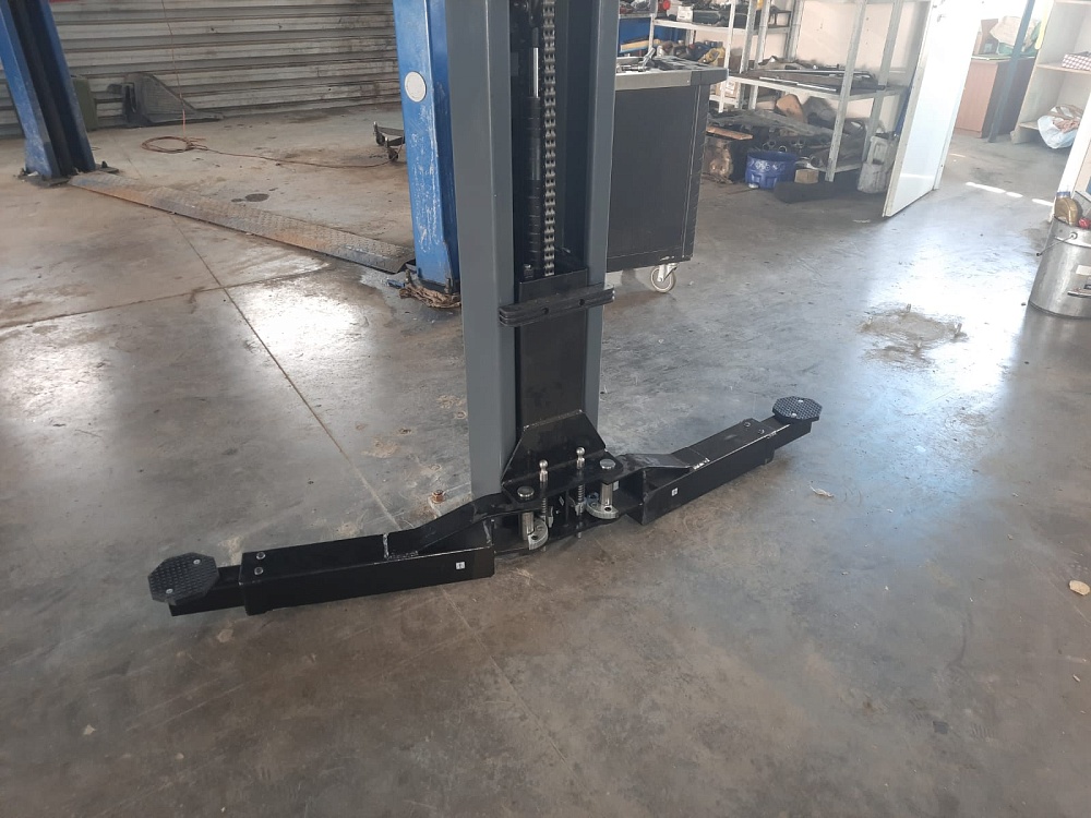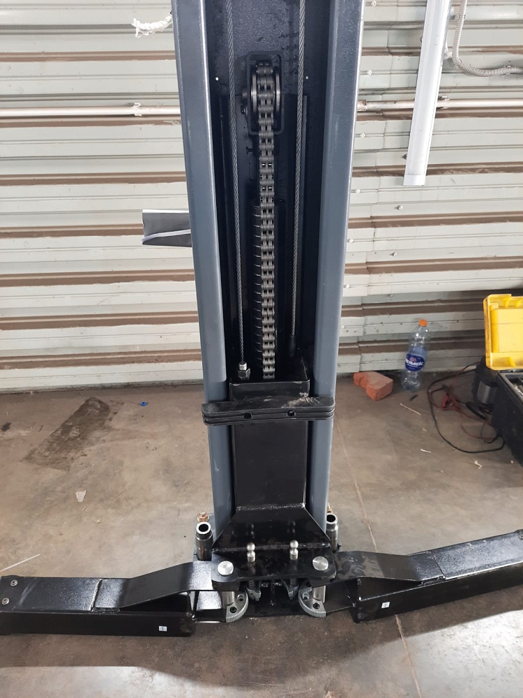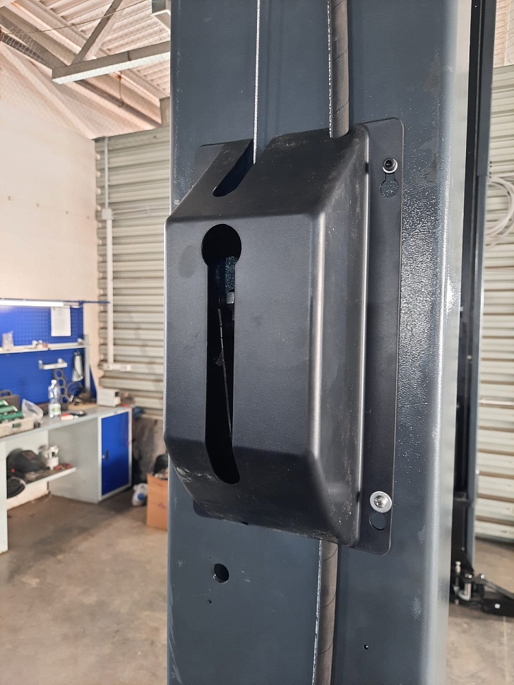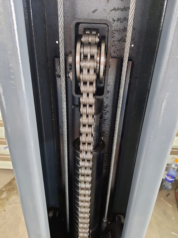 Грузоподъемность этого подъемника составляет 4000 кг. За подъем автомобиля отвечают два гидравлических цилиндра с цепным приводом каретки. Такой тип привода уменьшает нагрузку на гидроцилиндры и обеспечивает долговечность их работы. Каретки снабжены нейлоновыми ползунами, обеспечивающими плавное перемещение внутри стоек. Простая и, в тоже время, надежная система механических стопоров со снятием с одной стороны обеспечивает безопасное удержание автомобиля в поднятом состоянии на протяжении всего времени ремонта. Габаритная высота подъемника составляет 3650 мм и позволяет устанавливать его в помещениях с высотой потолка от 4 метров и выше.