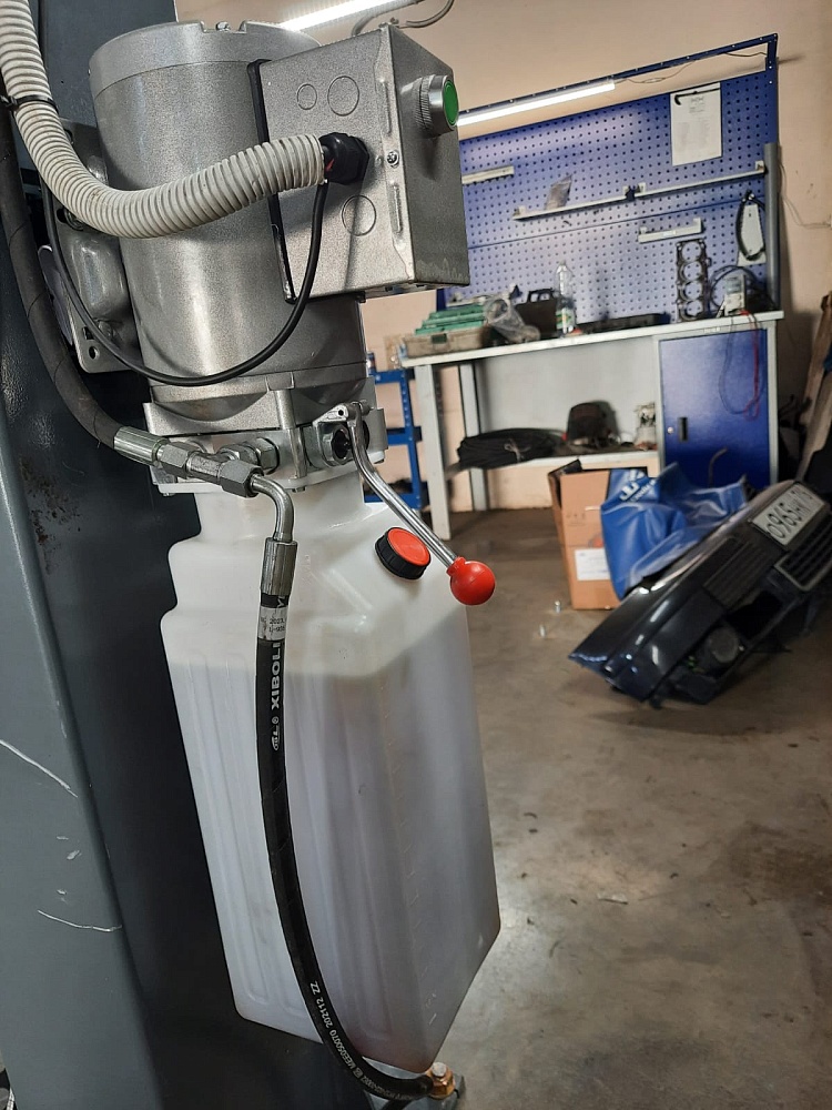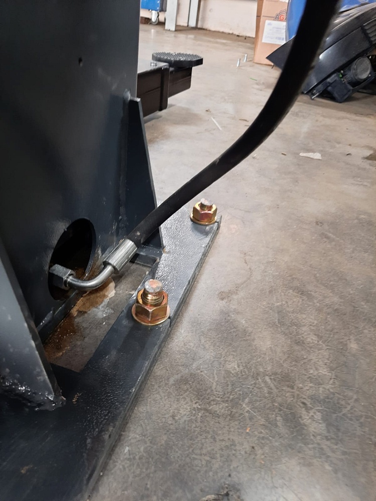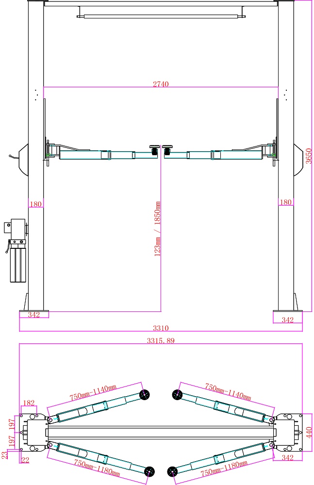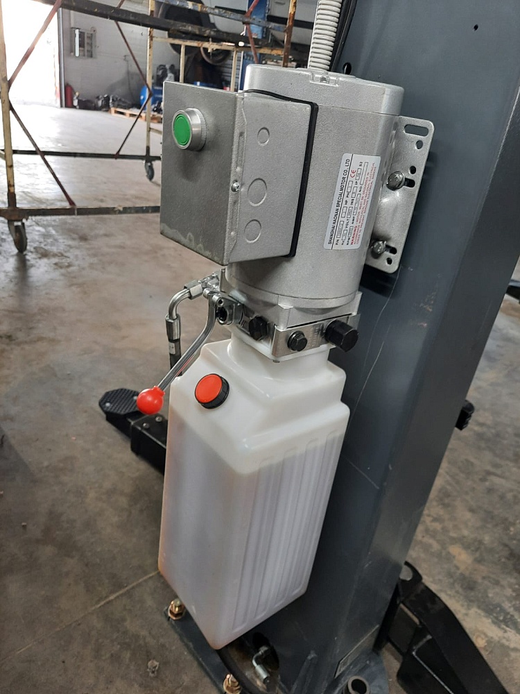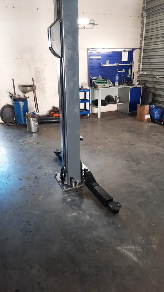 Подъемник двухстоечный электрогидравлический с управлением стопорами на одной колонне, асимметричный, двухцилиндровый, г/п 4000 кг., 2,2 кВт, высота подъема 1850 мм., расстояние между стойками 2740 мм., с верхней синхронизацией.
