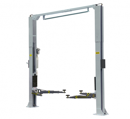 Подъемник двухстоечный электрогидравлический, асимметричные каретки, цилиндры прямого действия, г/п 4200 кг., 2,2 кВт, высота подъема 1910 мм., расстояние между стойками 2840 мм., с верхней синхронизацией стальным тросом.