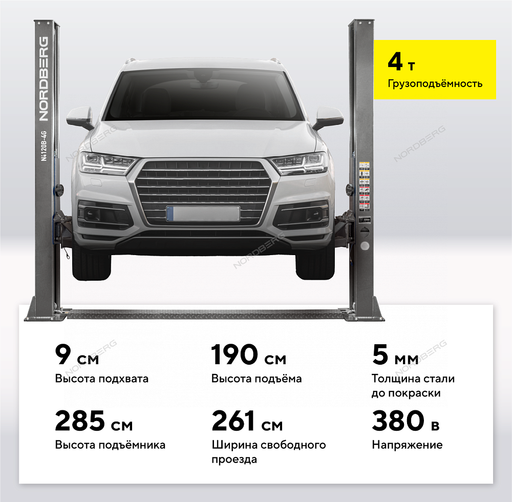 Двухстоечный подъемник NORDBERG N4120B-4G_3+2_380 – безопасное и надежное оборудование для проведения различных видов работ по обслуживанию и ремонту автотранспорта в автосервисах и СТО.