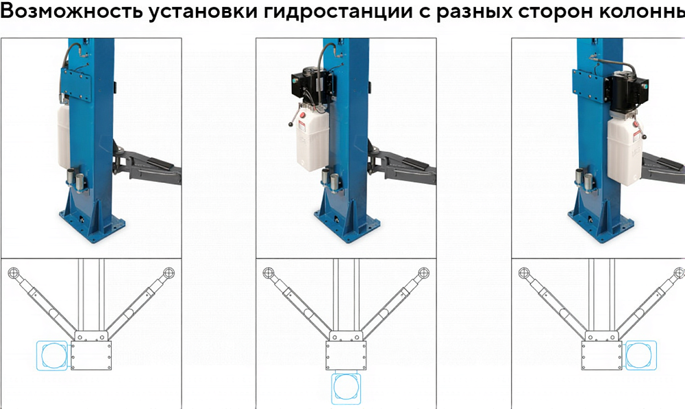 Конструкция двухстоечного подъемника APO-40C_220 позволяет установить гидростанцию на боковой или передней поверхности колонны.