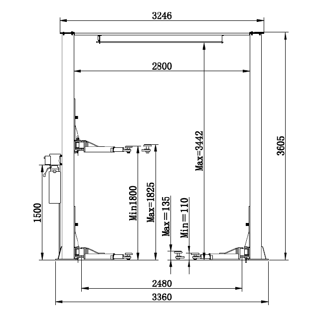 Двухстоечный электрогидравлический подъемник для легковых автомобилей, микроавтобусов, «джипов» и легких грузовиков типа «Газель» общей массой до 5 т. Верхняя синхронизация. Расположение стоек – симметричное. Электроуправление подъема и опускания.