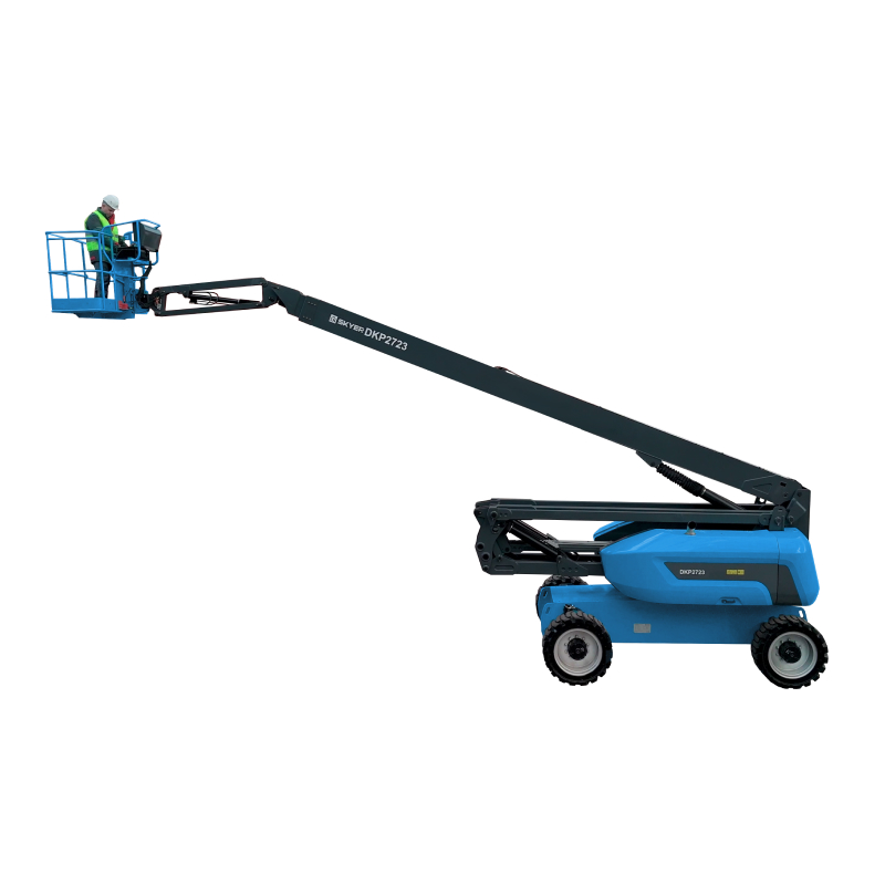 Самоходный коленчатый подъемник SKYER DKP2723 — это маневренная, высокопроизводительная техника с мощным дизельным двигателем. Рабочая высота модели составляет 26.92 м, максимальная грузоподъемность — 230 кг. Такое оборудование позволяет проводить работы даже в труднодоступных точках благодаря стреле с поворотным гуськом, коленчатыми сочленениями и корзиной, которая может вращаться на 160°.