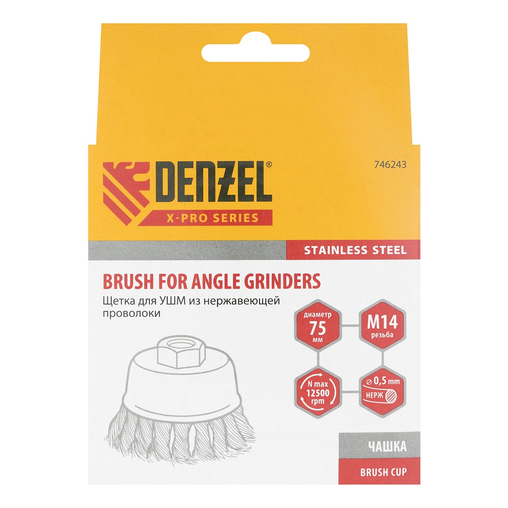 <p>Щетка для УШМ «Чашка» Denzel 746243, М14, диаметром 75 мм, с щетиной из крученой нержавеющей проволоки диаметром 0,5 мм, предназначена для грубой очистки твердых поверхностей от ржавчины, лакокрасочных покрытий, загрязнений, удаления заусенцев, а также для зачистки сварных швов. Снимает толстый слой материала, идеально подходит для обработки изделий из нержавеющей стали. Щетка имеет форму чашки и позволяет очищать участки большой площади. Оснастку устанавливают на вал углошлифовальной машины. Рекомендуемая максимальная скорость вращения составляет 12500 об/мин. Во время работы следует использовать средства индивидуальной защиты — очки, респиратор, наушники, перчатки, а также специальную одежду и обувь. Щетка применяется в строительстве, на производстве, а также в быту.</p><h2>Преимущества</h2><ul><li>Проволока толщиной 0,5 мм, скрученная в пучки, придает щетине устойчивость к повышенным нагрузкам.</li><li>Покрытый эмалью корпус и щетина из нержавеющей стали AISI 201 не ржавеют, поэтому щетку можно использовать в условиях сильной влажности.</li><li>Частицы проволоки из нержавейки, остающиеся на обрабатываемой поверхности, не вызывают ее коррозии.</li><li>Усиленный корпус и гайка обеспечивают повышенную прочность щетки.</li><li>Крепление на гайку М14 ускоряет установку и замену оснастки.</li><li>Строгий контроль качества на всех этапах производства подтверждает надежность щетки.</li></ul>