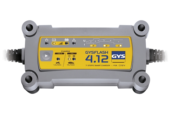 GYSFLASH 4.12 - это специально разработанное устройство для зарядки 12-В аккумуляторов автомобилей, мотоциклов, гидроциклов, картов, газонокосилок и т.п. Процедура зарядки в 7 этапов обеспечивает двукратное уменьшение времени зарядки по сравнению с традиционными 4-А зарядными устройствами.