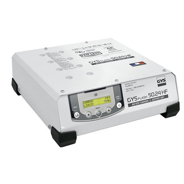GYSFLASH 50-24 HF - это источник стабилизированного напряжения и тока инверторной технологии с 5 функциями: - зарядка АКБ с помощью аппарата с развернутой кривой зарядки; - подпитка АКБ 6, 12 и 24-В (с жидким или гелевым электролитом) автомобилей в процессе диагностики; - обеспечение хорошего состояния АКБ выставочного автомобиля в режиме "Showroom"; - Компенсация электроэнергетических потребностей в целях сохранения настроек автомобиля во время замены АКБ; - использование зарядного устройства как источника стабилизированного питания, напряжение и максимальный ток которого можно настроить.