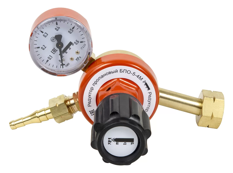 Редуктор пропановый КЕДР БПО-5-4М (8012031) предназначен для понижения давления газа, поступающего из баллона, и автоматического поддержания заданного рабочего давления постоянным при газопламенной обработке.