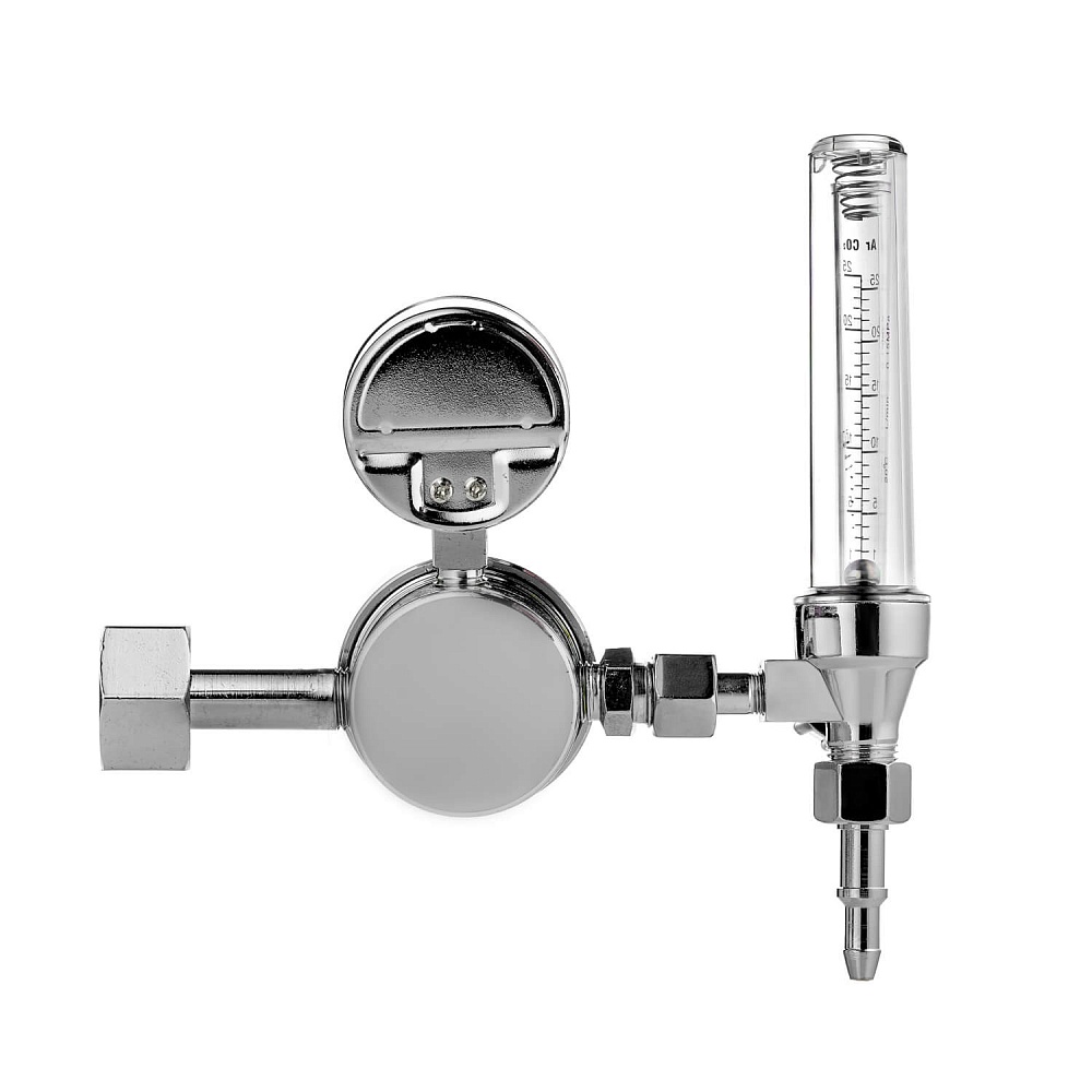 Кислородный редуктор в литым латунным корпусом. Эргономичные задающие винты и защитные кожухи на манометрах. Поставляется в комплекте с универсальным ниппелем и прокладкой входного штуцера.