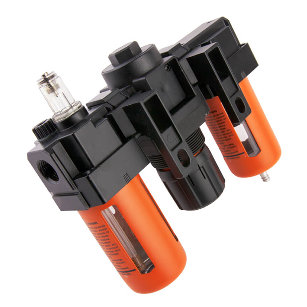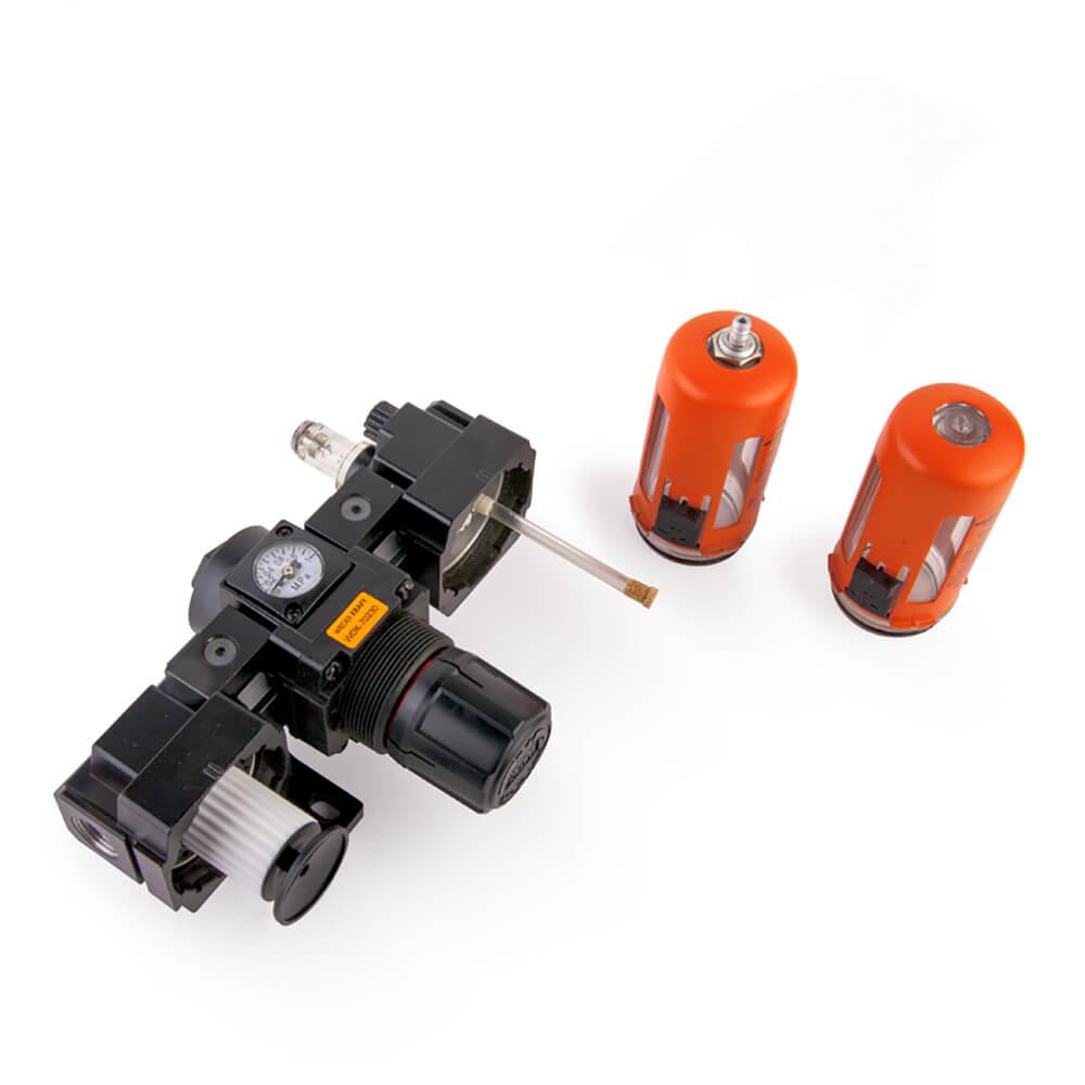 WDK-70230 Блок подготовки воздуха Описание товара WDK-70230 Блок подготовки воздуха Блок подготовки воздуха состоит из влагоотделителя, лубрикатора, регулятора и манометра, двух L-образных скоб-держателей. Резьбовое соединение 3/8″. Незначительное падение давления при производительности до 1500л/мин. Сменный фильтрующий элемент 5мк (опционально 0,01мк, 0,3мк, 1мк, 25мк, 40мк). Рабочая температура -5°С +60°С, рабочее давление до 10 бар.